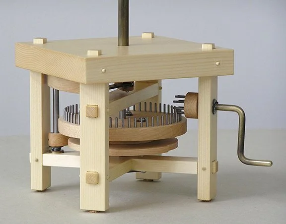 The Chicken Head measures: 4-3/4” wide x 4-3/4” deep x 18” high. The base is pine with maple gears and levers. The head is milk-painted basswood. The pole and handle are brass, with brass waters, steel pins & screws.