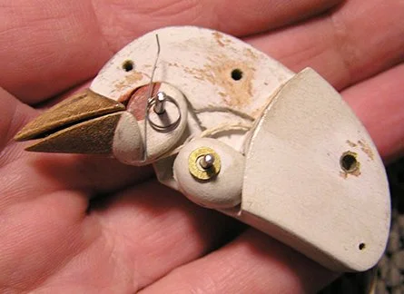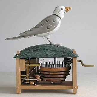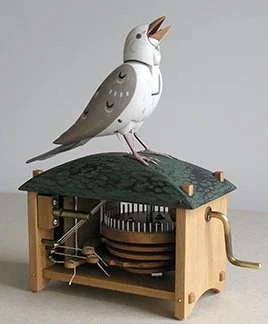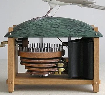 The Chirping Bird is a simpler version of the Singing Bird. When cranked, the Bird stands up, its tail flipping & its throat moving as it chirps. The sound is produced by miniature bellows that blow air through a small brass whistle.