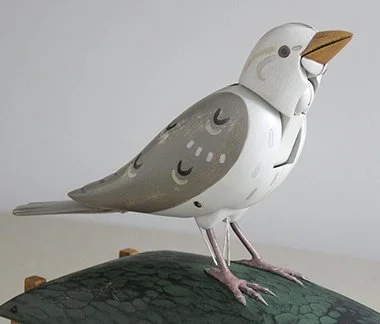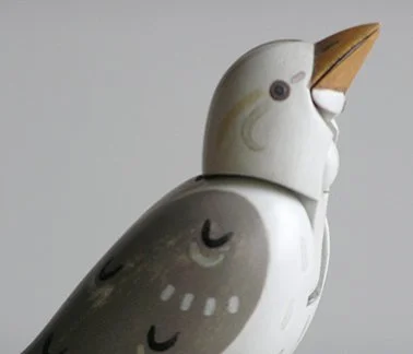The Chirping Bird measures: 7” wide x 3-1/2” deep x 8” high. The stand and mechanism are made from madrone. The bird and base are milk-painted basswood. Leather bellows, brass and steel pins & screws.