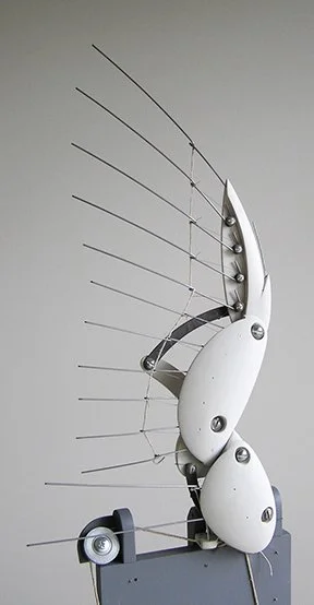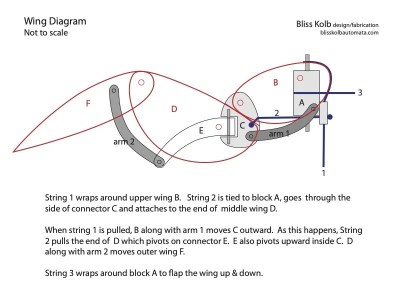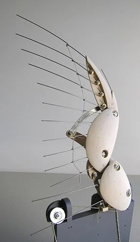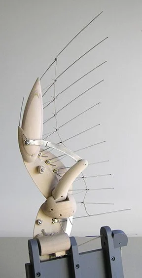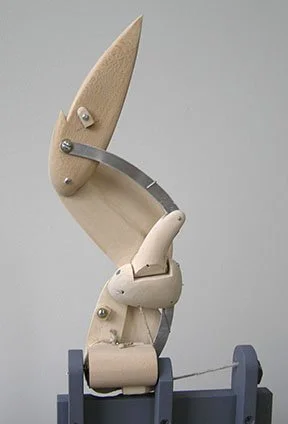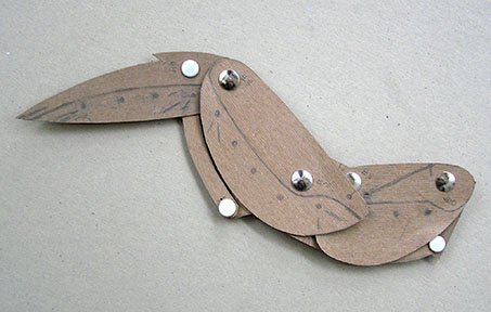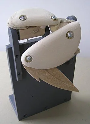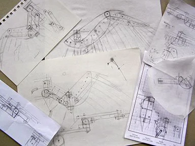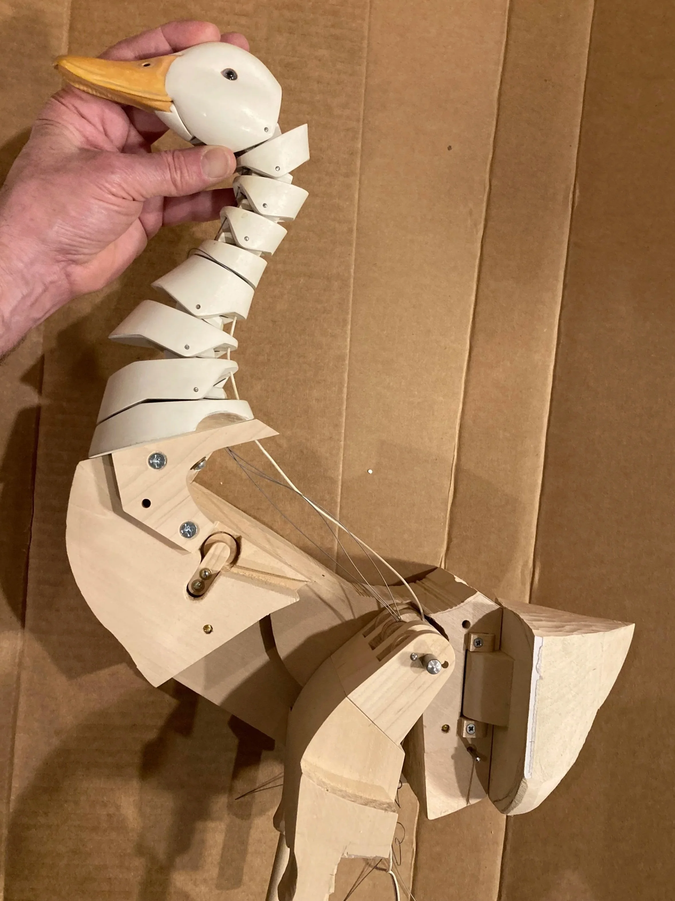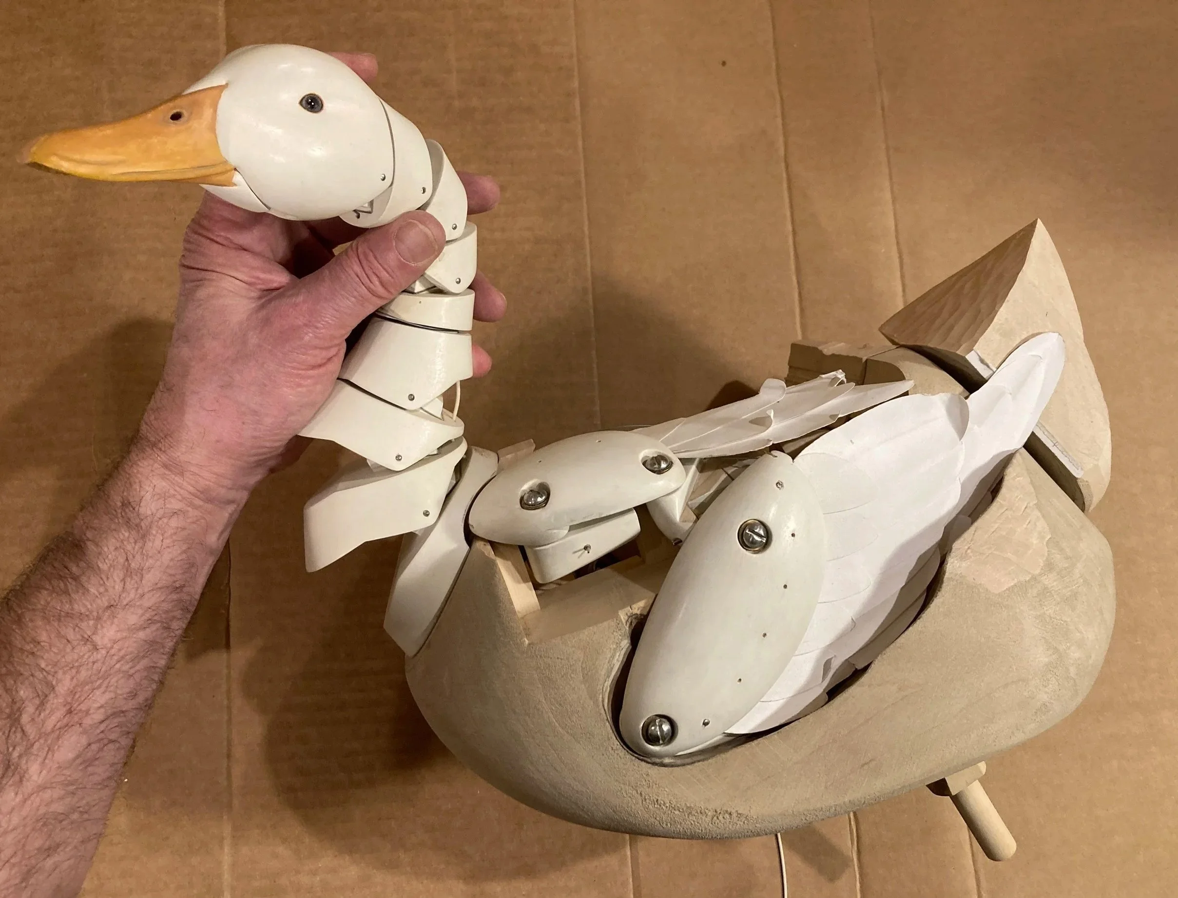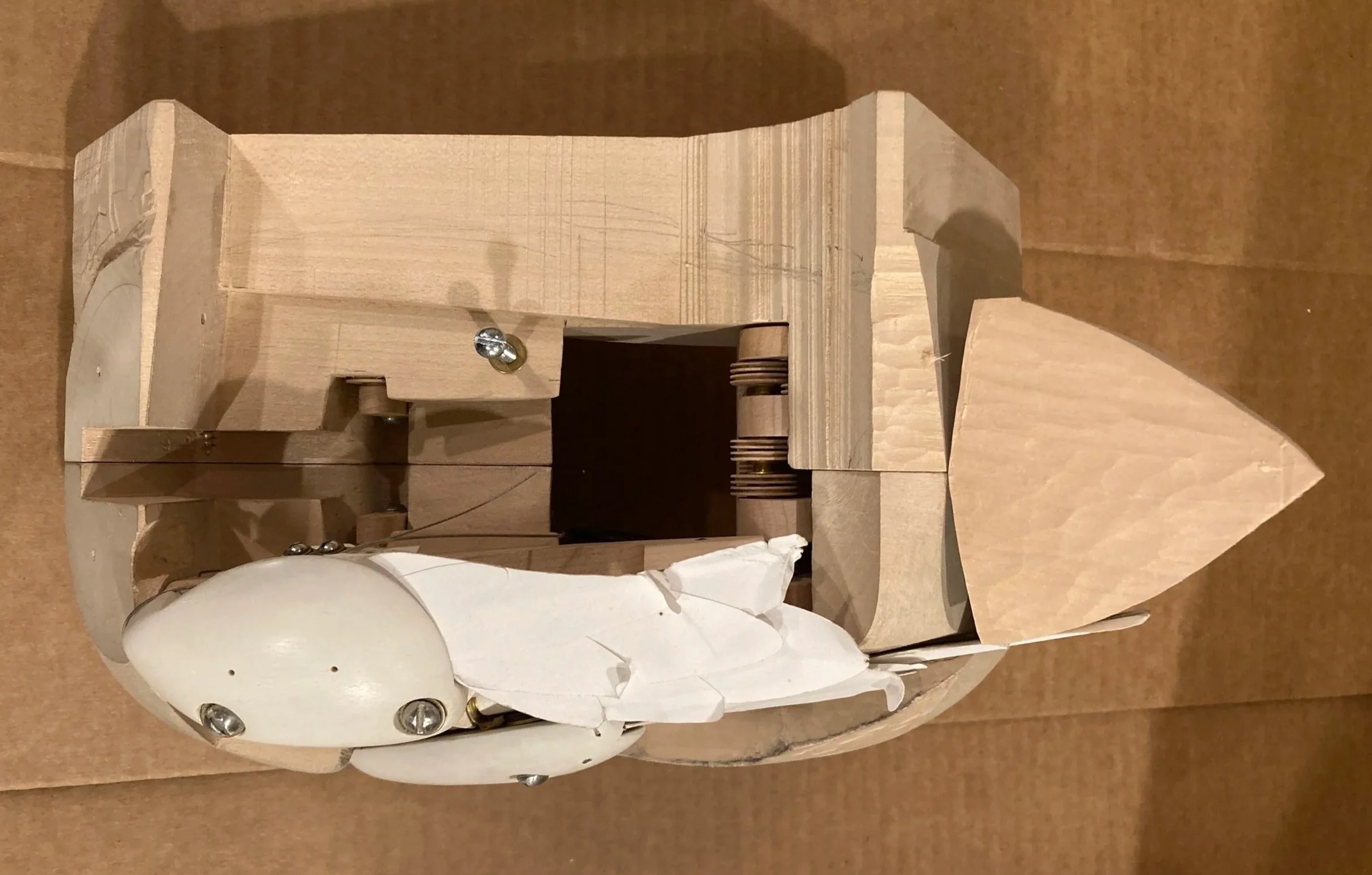 The start of the wings. A working cardboard model is made from the result of sketches going back at least to the 1980’s. The goal: to make a mechanical duck’s wing that imitates the movements & geometry of a real duck’s wing, opening & closing, with the least controls.