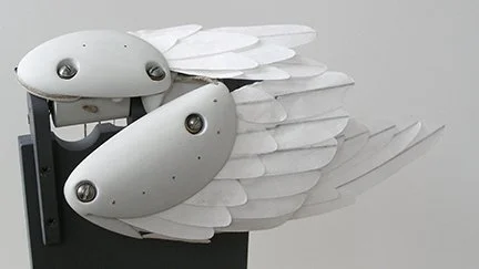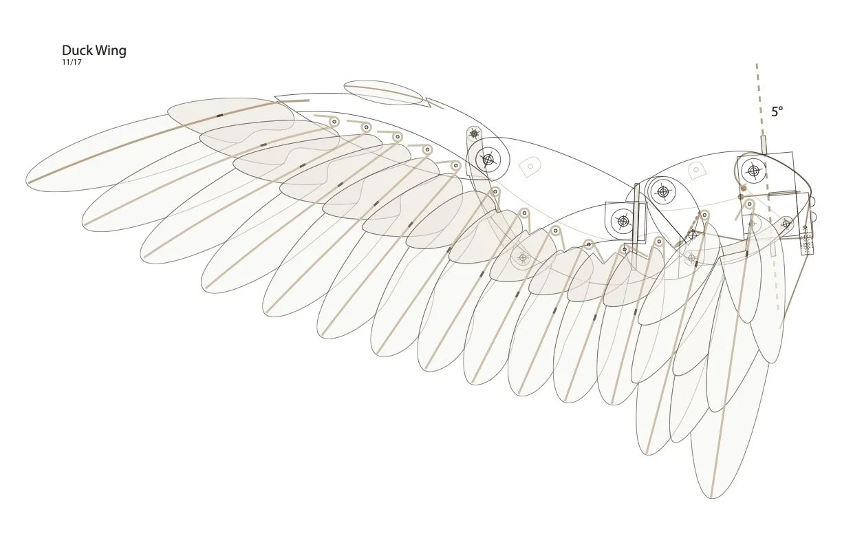 The wing opens & closes as closely as possible to a real duck’s wing. The primary, secondary & tertial feathers each fan separately. One cable opens the wing, a second cable flaps the wing up & down.