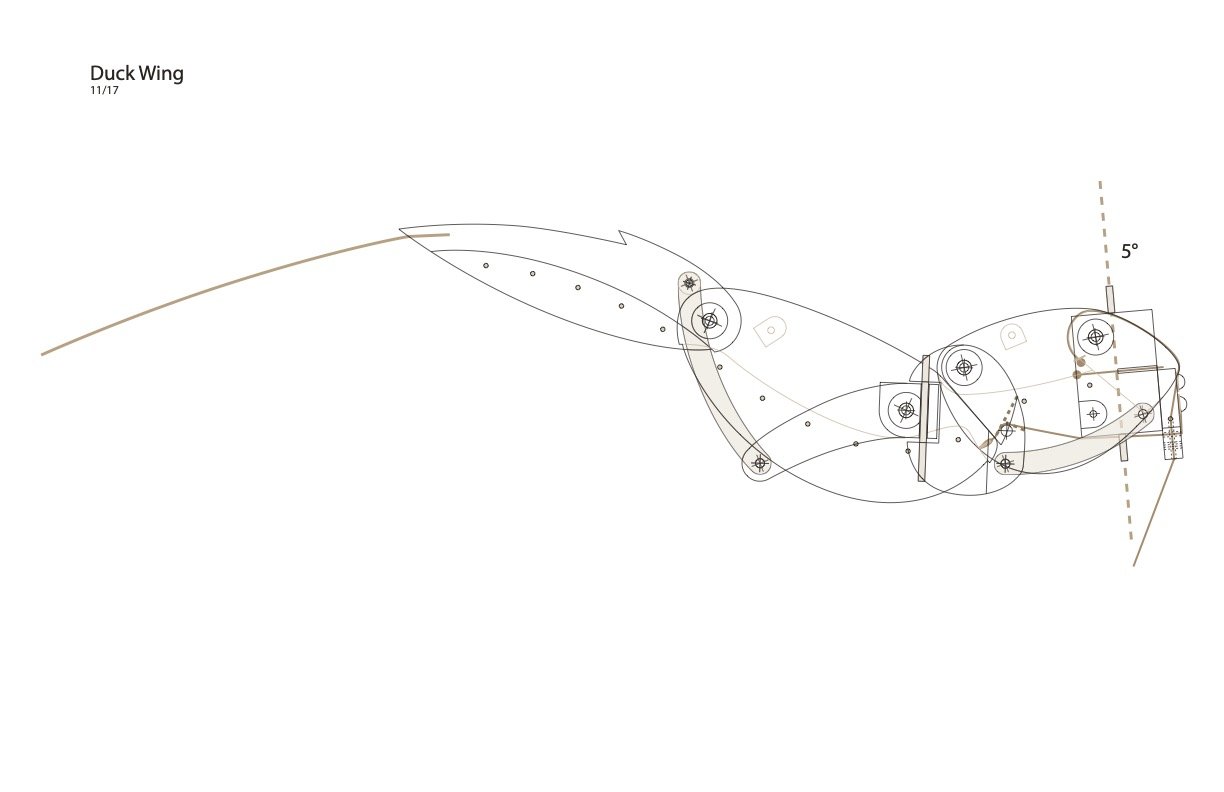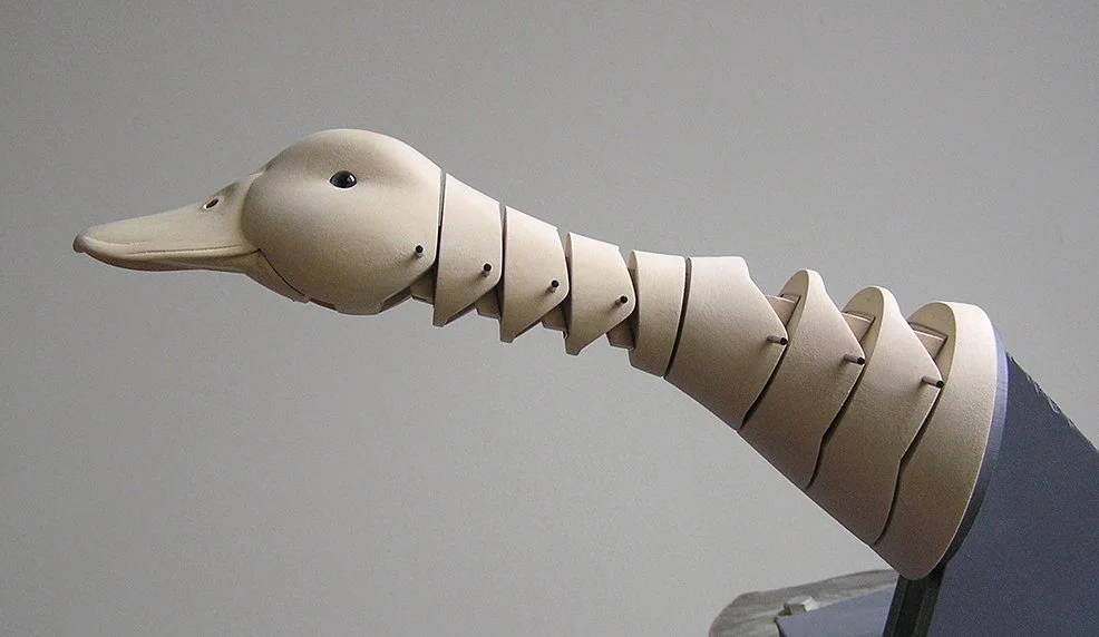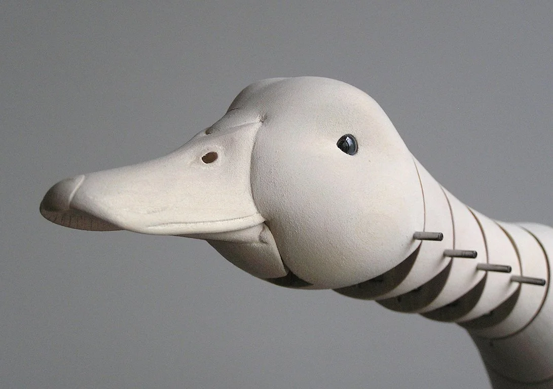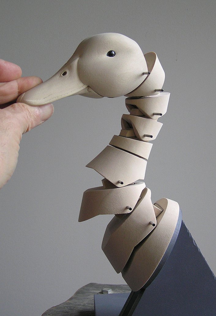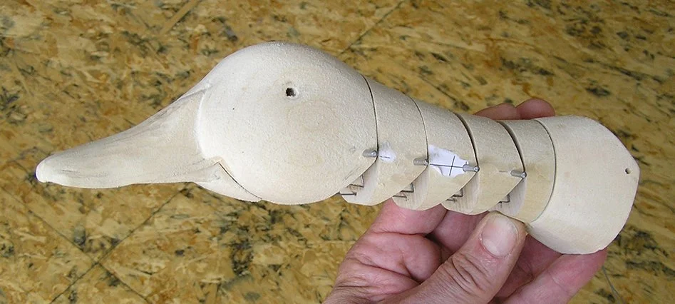 It took some experimentation to find the right angle and placement for the Duck’s Neck in relation to the Wings and the Body. The Body is in two parts, front & back. The Neck is attached to the Body’s back by an angled support bracket. The Legs pivot at the hips and contain nine pulleys, one for each of the movements within the Duck. The Tail’s pivot is attached to the rear half of the Body. Viewed from the top, the wing brackets are angled toward the tail. It took some time to relief carve the Body to allow the Wing to close into it.