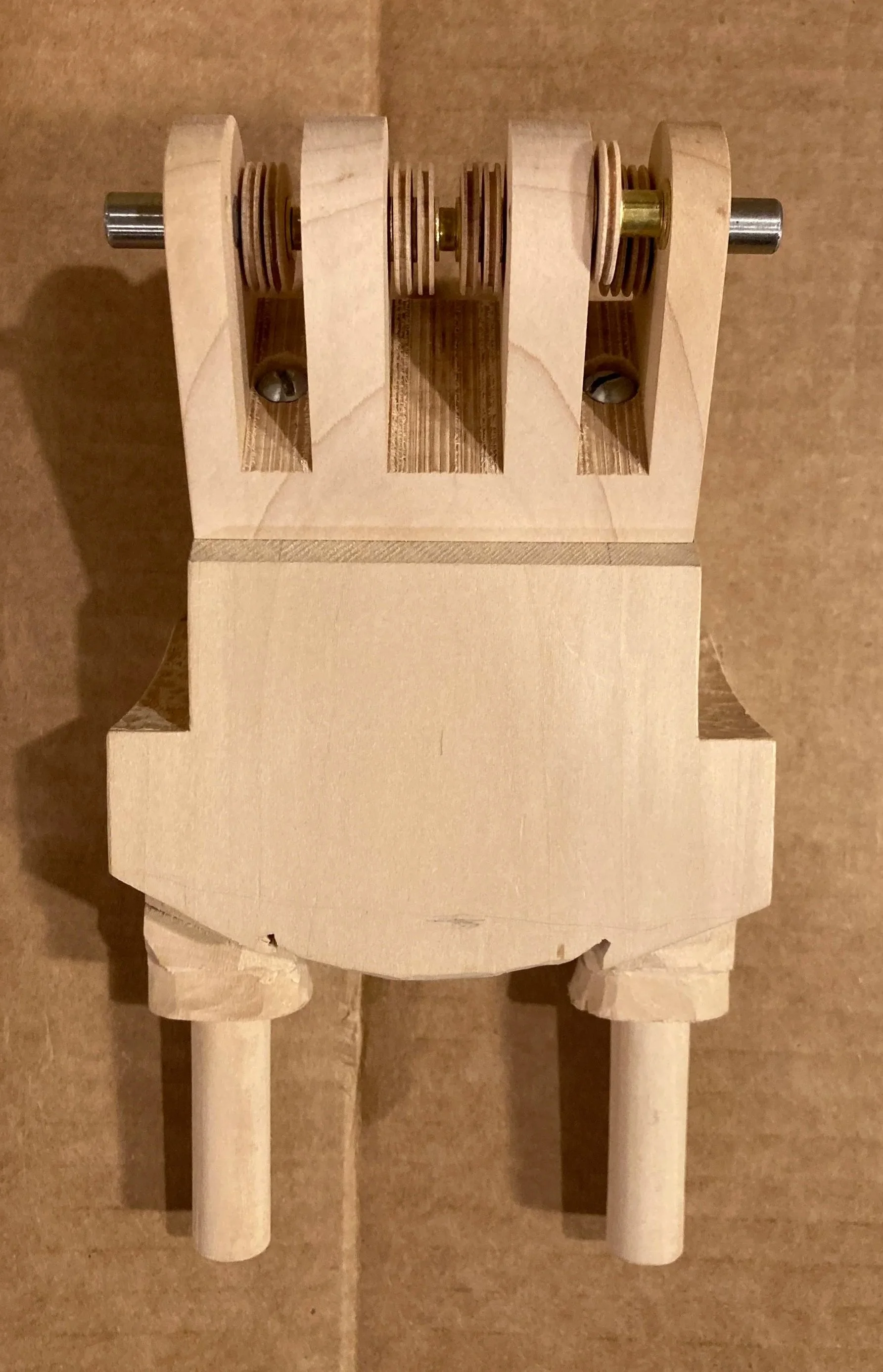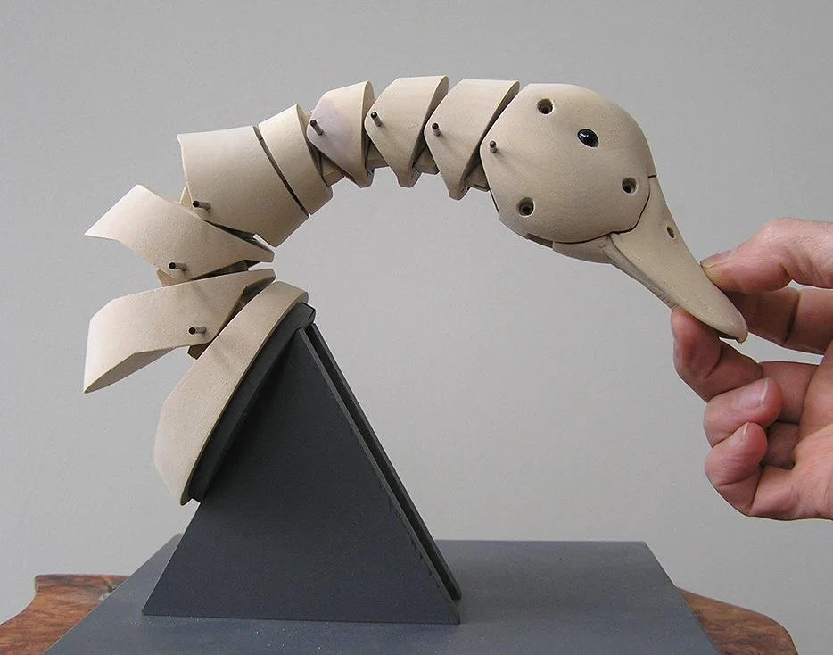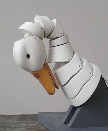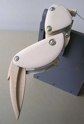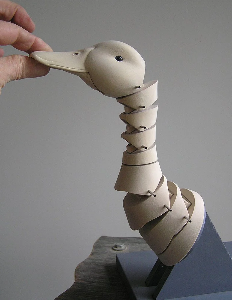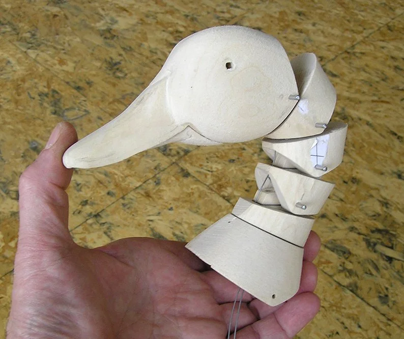 It took some experimentation to find the right angle and placement for the Duck’s Neck in relation to the Wings and the Body. The Body is in two parts, front & back. The Neck is attached to the Body’s back by an angled support bracket. The Legs pivot at the hips and contain nine pulleys, one for each of the movements within the Duck. The Tail’s pivot is attached to the rear half of the Body. Viewed from the top, the wing brackets are angled toward the tail. It took some time to relief carve the Body to allow the Wing to close into it.