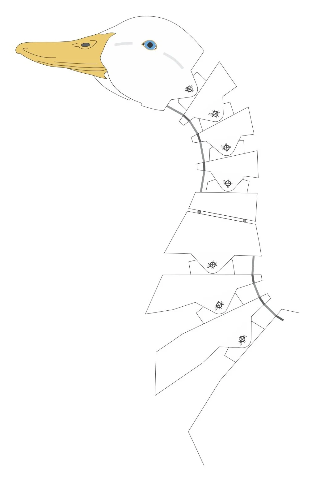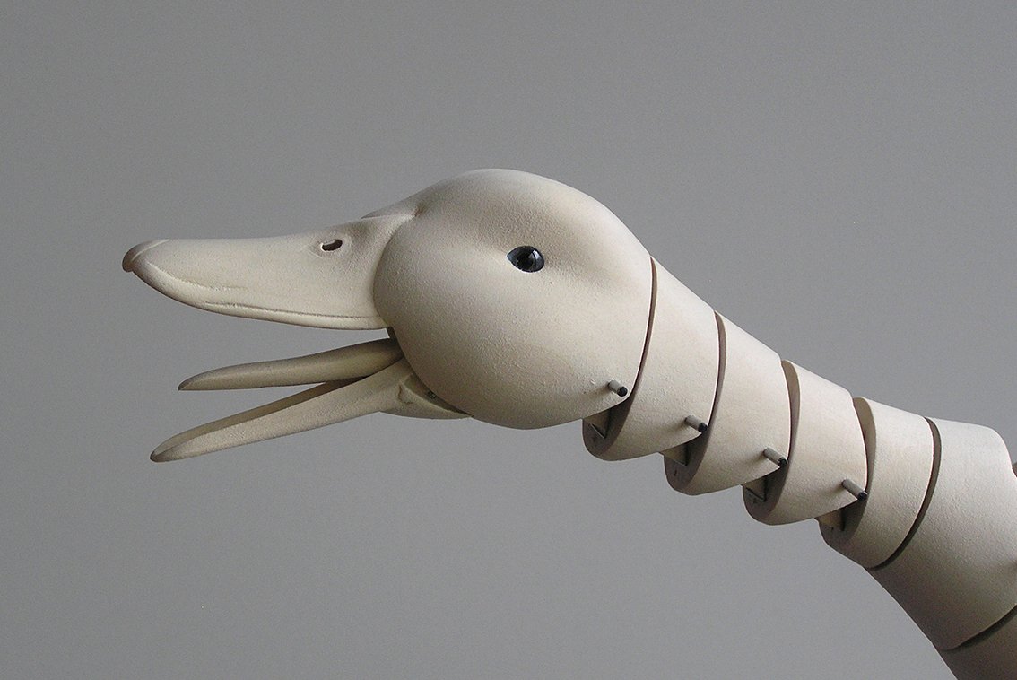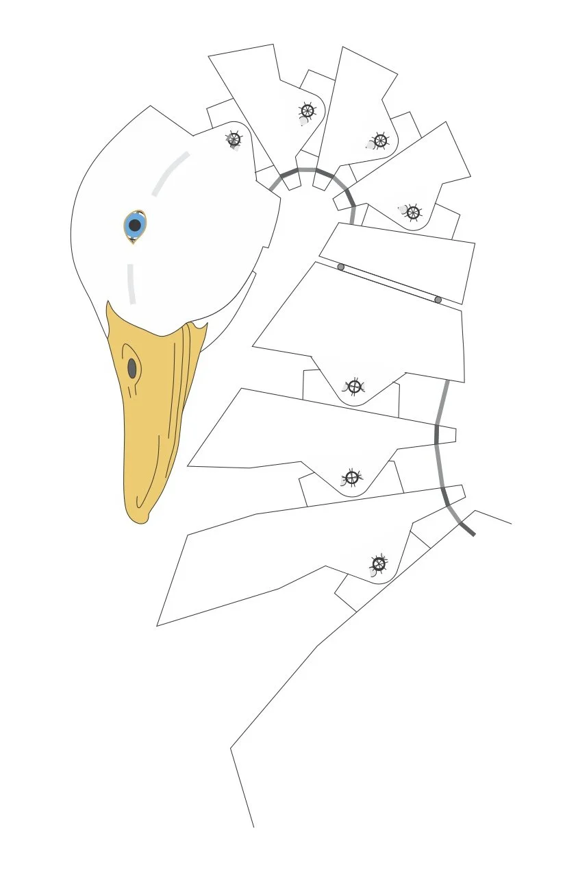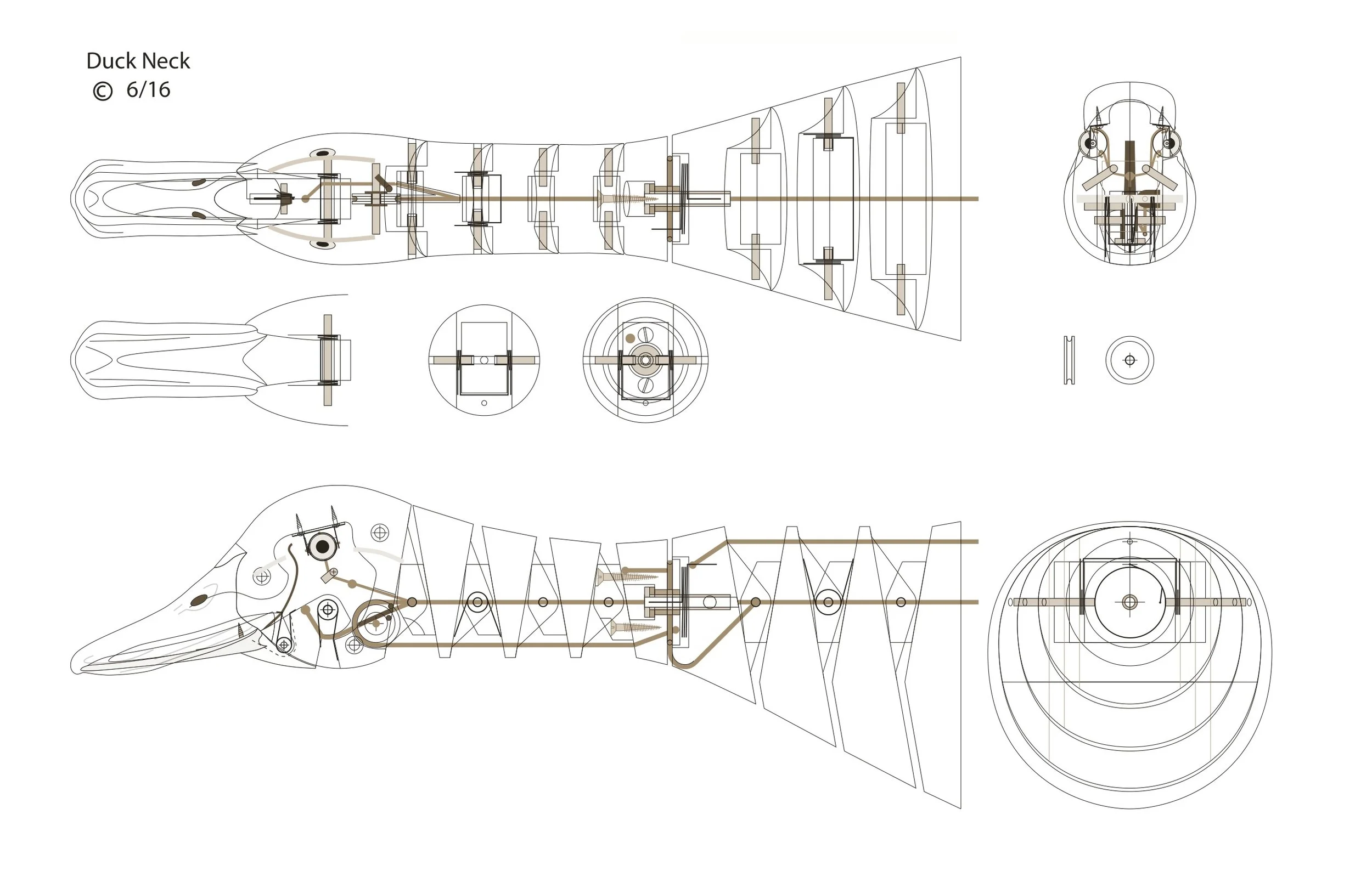 The neck has four movements each operated by its own cable. One cable flexes the lower neck, one flexes the upper neck, one swivels the neck at its center and one opens the beak.