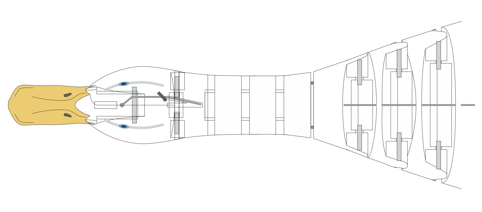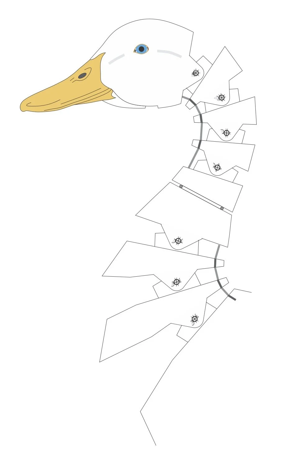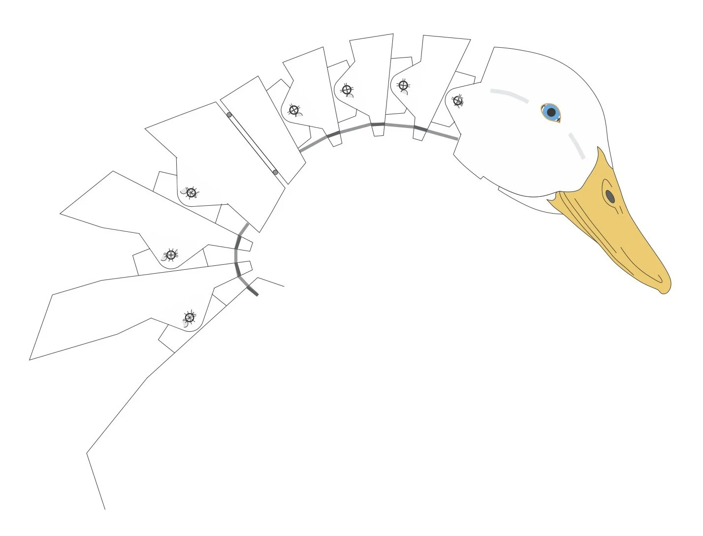The neck has four movements each operated by its own cable. One cable flexes the lower neck, one flexes the upper neck, one swivels the neck at its center and one opens the beak.