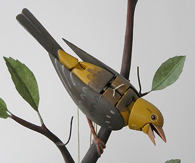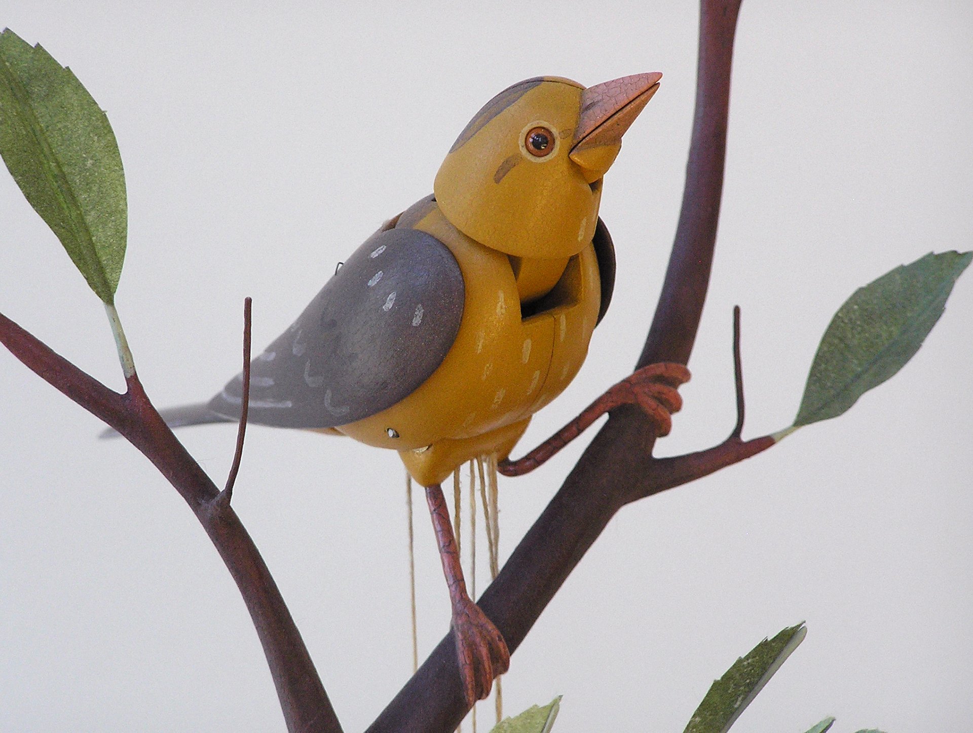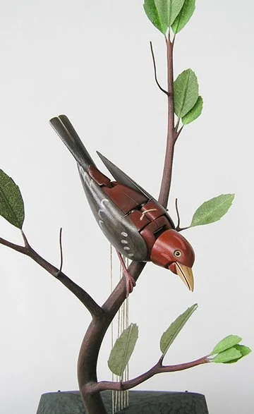 The Singing Bird measures : 6-1/2” wide x 6-1/2” deep x 24” high. The stand is teak, the exposed mechanism cherry, and the bird and base are milk-painted basswood. The branch is paper mache with water-colored, rice paper leaves. Glass eyes, brass & steel pins and screws.