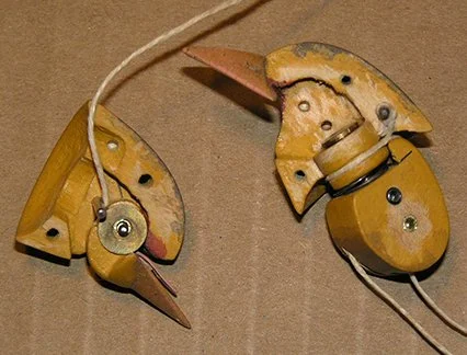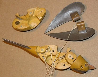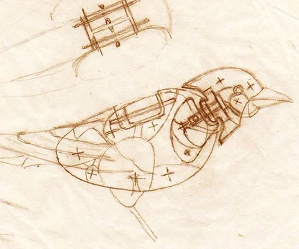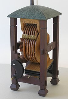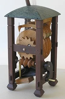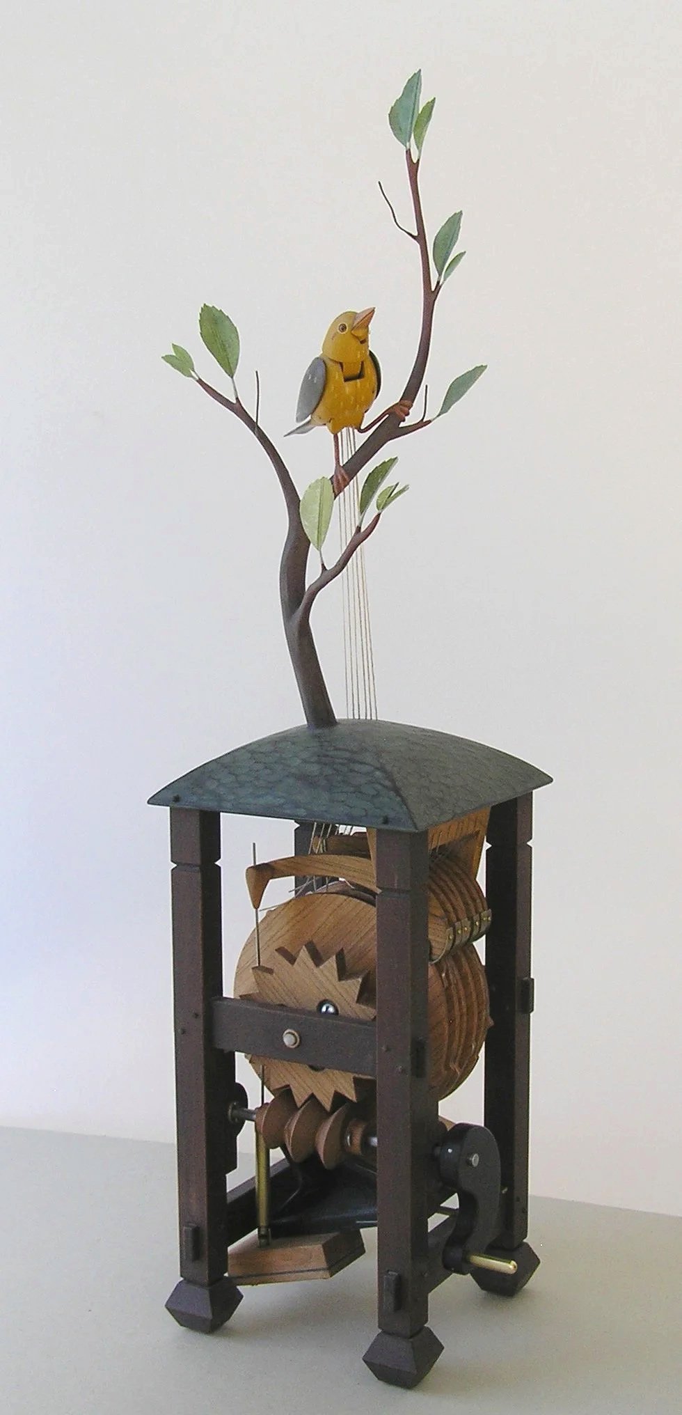 The Singing Bird is my version on an old-world theme. The Bird has six movements and sings a simple bird song. It features a wooden worm gear that operates a star gear and eight cams. Each cam operates a lever that control one of the bird’s movements and its song. The song comes from leather bellows that blow air though a brass whistle who’s pitch is varied by a plunger operated by its own lever and cam.