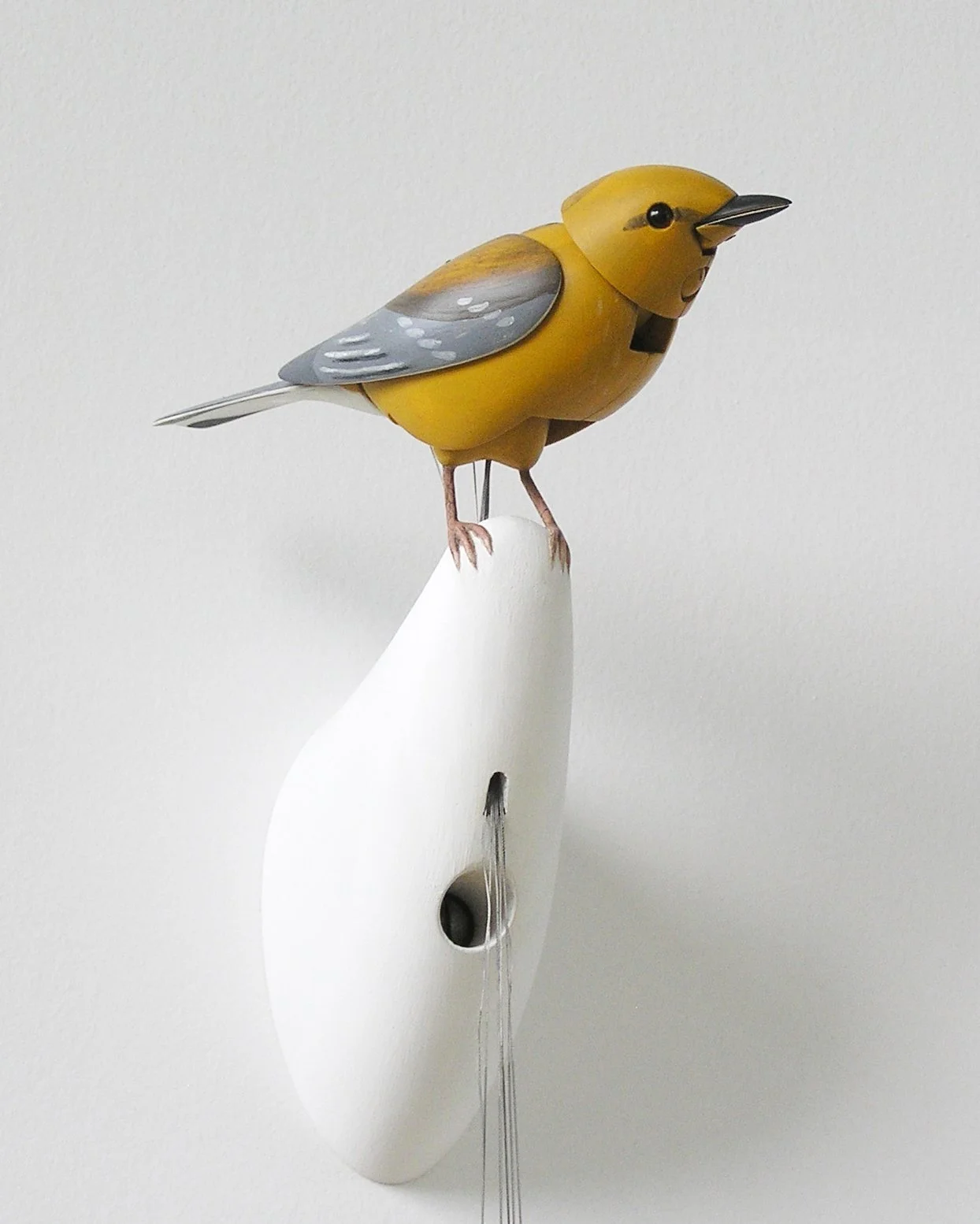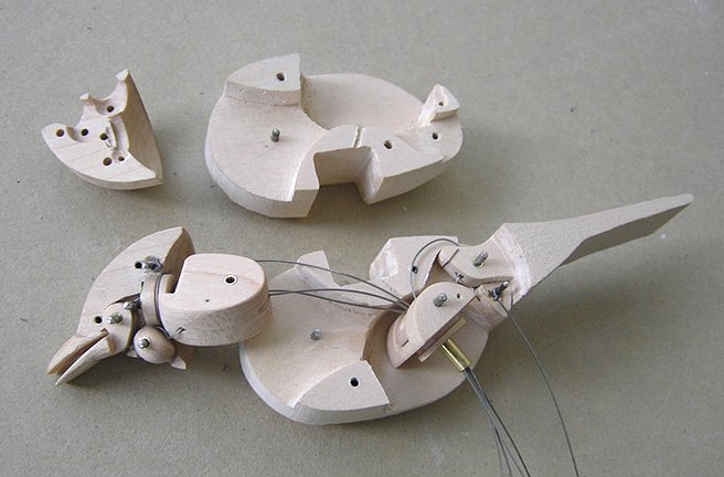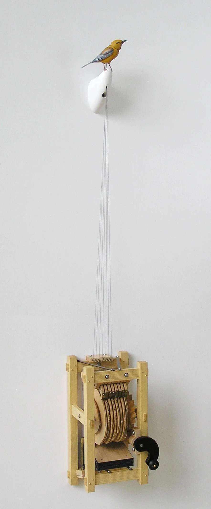 The mechanism measures: 6-1/2” wide x 7-1/2” deep x 12-1/2” high. The bird with perch is approximately 6” high. The mechanism’s frame is pine with an ebony handle, the moving parts are maple with brass & steel pins, straps and hardware. The bird is milk-painted maple & basswood with glass eyes and brass & steel pins and screws.