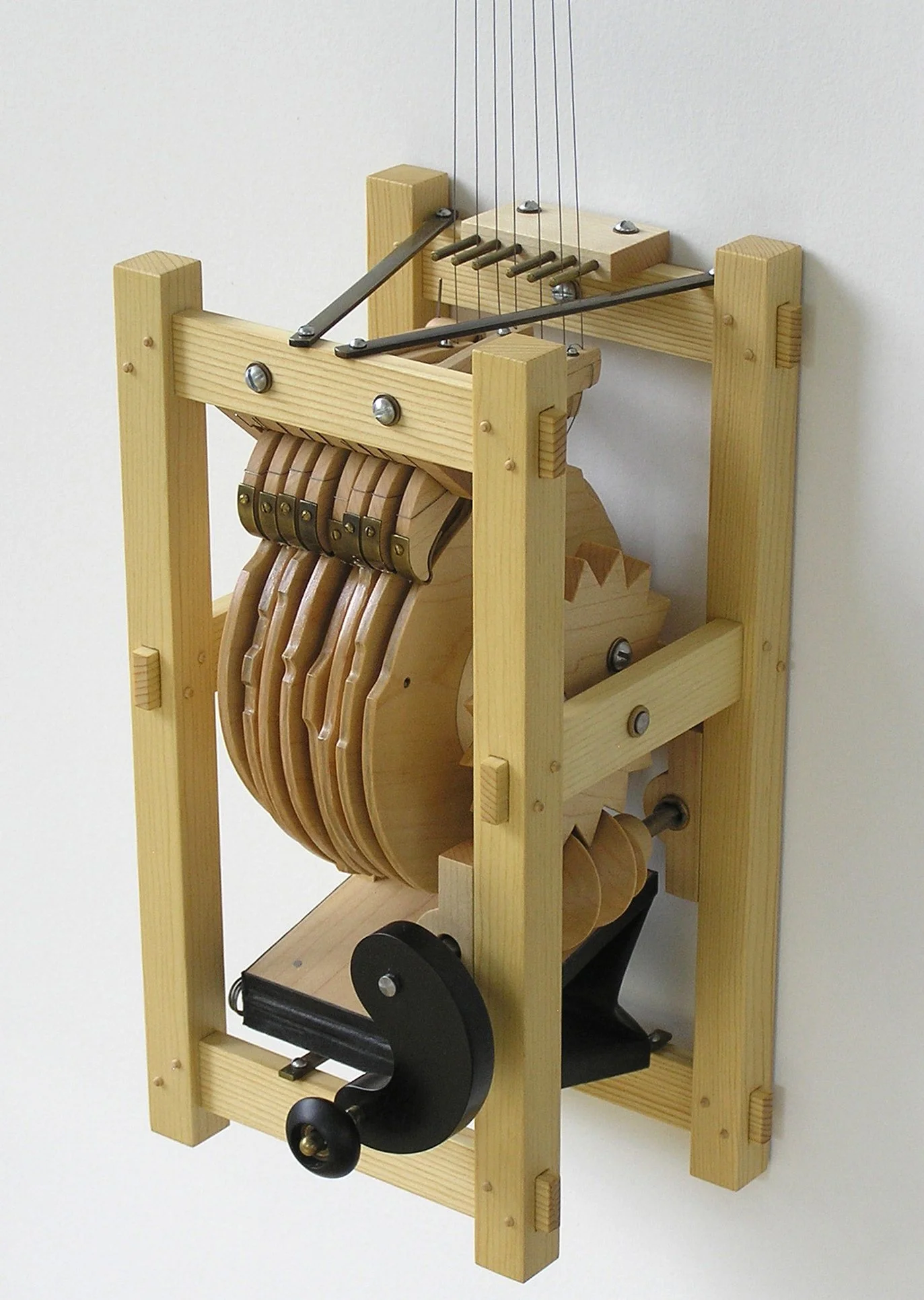 The Singing Bird on Wall is directly fastened to the wall. The mechanism is at waist height and the bird just above eye level. It has seven movements and sings a simple bird song. A wooden worm gear operates a star gear and nine cams. Each cam operates a lever and cable that pull each of the bird’s movements. The song is produced by leather bellows that blow air through a brass whistle whose pitch is varied by a plunger operated by its own lever and cam.